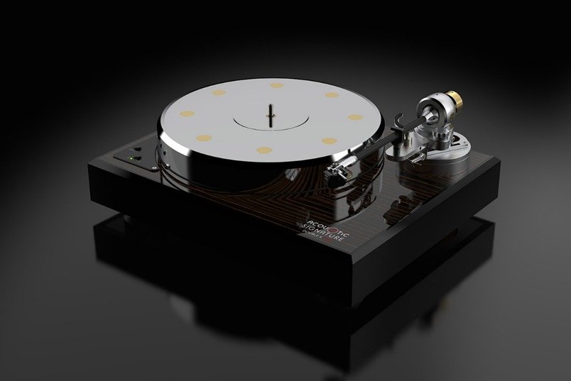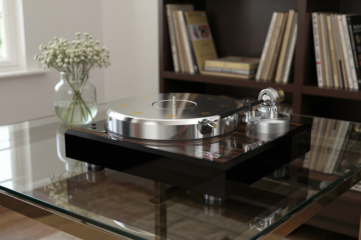 El chasis multicapa de MDF, acero y multiplex, acabado en laca piano con opción de elegante madera macassar, aporta una base robusta y libre de resonancias. Su plato de aluminio anodizado de 10 kg, amortiguado con ocho silenciadores de latón bañados en oro, gira sobre el innovador cojinete Dura Turn Diamond, que asegura una fricción mínima, ausencia de mantenimiento y una durabilidad de por vida.