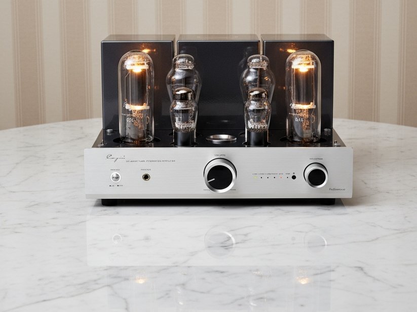 Veinticuatro vatios por canal, diseño de triodo , amplificador estéreo integrado Pure Class A con 845 válvulas de potencia de salida.