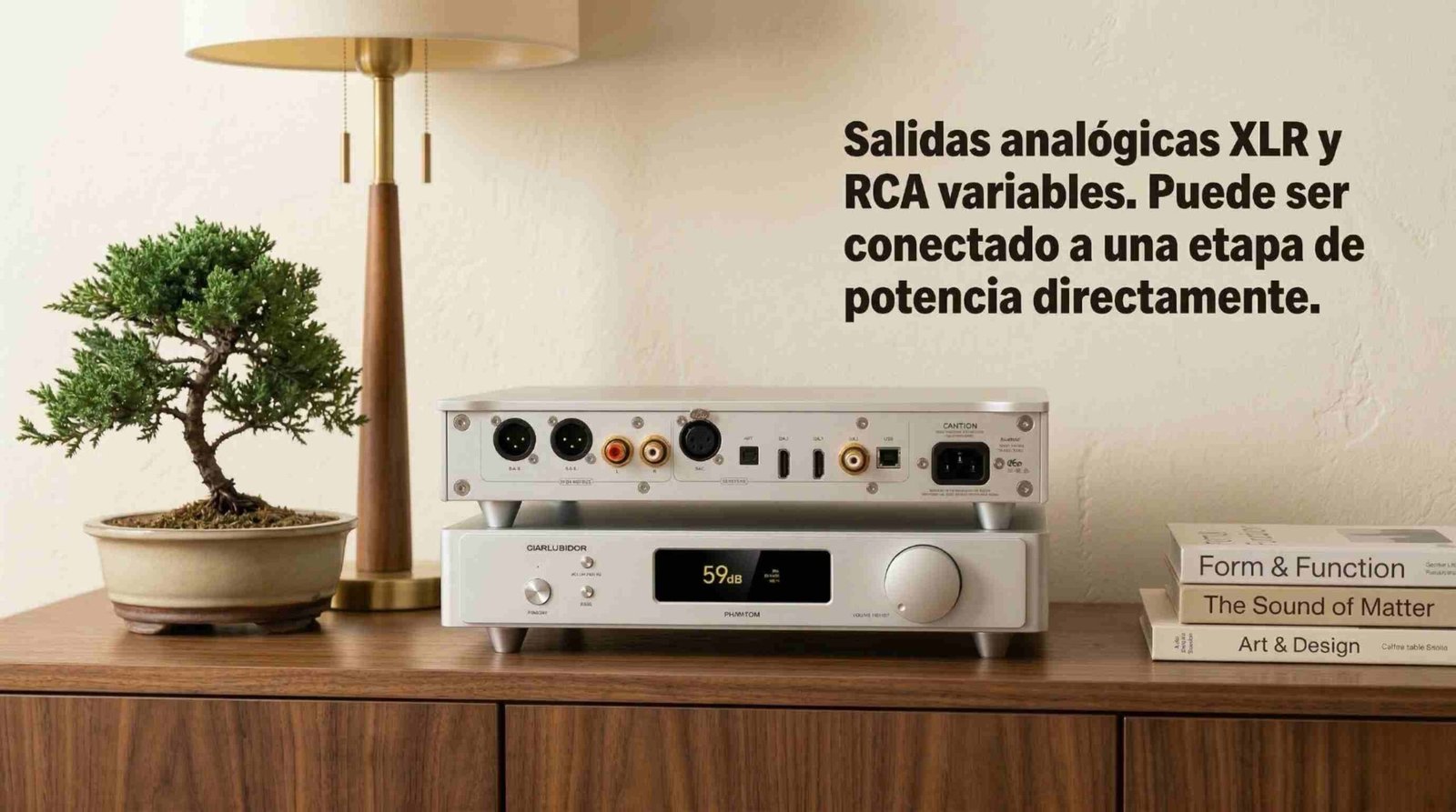 El Garlubidor Phantom incorpora salidas analógicas RCA y XLR, lo que permite utilizarlo directamente como preamplificador dentro de un sistema de alta fidelidad.