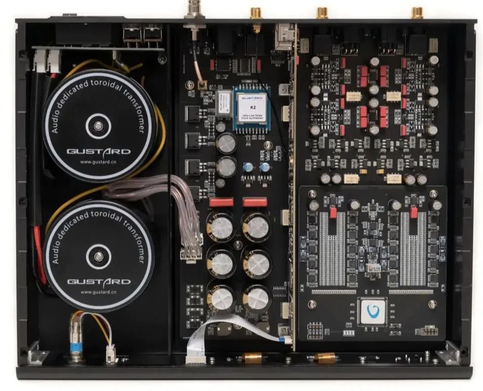 Su arquitectura R-2R discreta (sin chips DAC comerciales) convierte la señal digital mediante matrices de resistencias de alta precisión, conmutadas por un sistema FPGA + CPLD propio de Gustard.