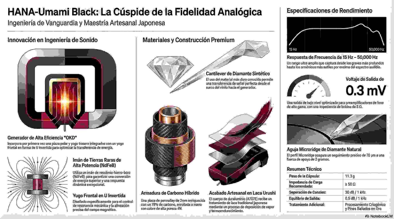 La HANA Umami Black es la culminación del arte japonés en cápsulas de bobina móvil (MC). Diseñada por el maestro Masao Okada-san y fabricada por Excel Sound en Japón, reúne medio siglo de experiencia en un producto excepcional.