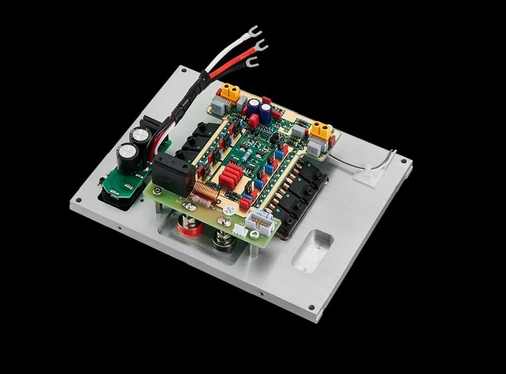Concebido como la culminación de la serie EX, el EX-B7 representa el ideal audiófilo llevado a su máxima expresión. Cada monobloque alberga dos transformadores toroidales de 450 VA cada imp y un banco de condensadores de gran capacidad, alimentando una etapa de salida con cuatro pares de MOSFET EXICON laterales. Todo ello dispuesto sobre una placa bañada en oro de 0,2 µm, con amplias zonas de soldadura y blindaje adicional para minimizar pérdidas e interferencias.