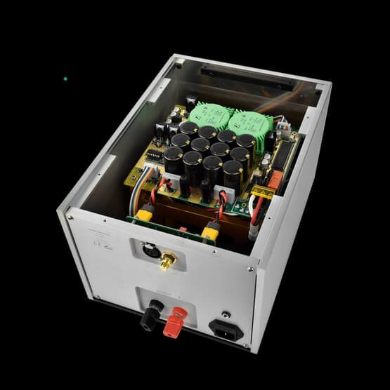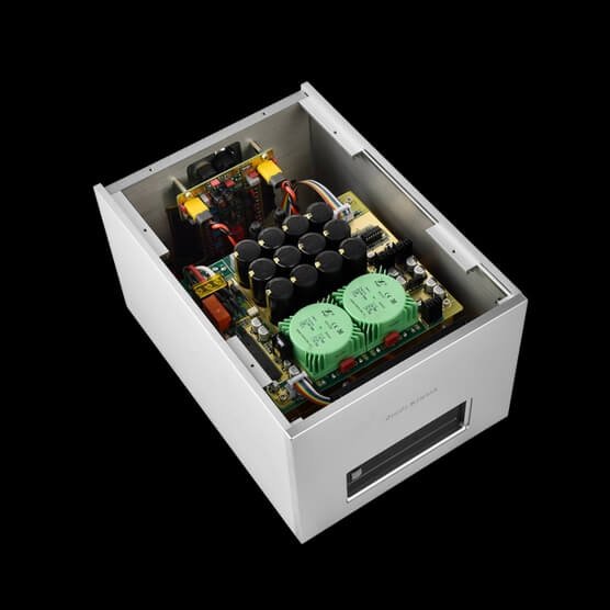 La construcción es tan sobria como imponente: disipadores de aluminio anodizado dorado, cableado interno corto y una distribución totalmente dual mono real, incluso en el propio monobloque. El resultado es un amplificador con una reserva de energía y una estabilidad térmica excepcionales, capaz de mantener la coherencia tímbrica y la transparencia incluso en los pasajes más exigentes.