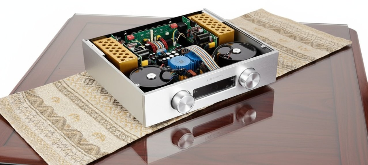 En su corazón laten dos módulos de potencia independientes montados sobre disipadores dorados de aluminio macizo. Cada módulo utiliza MOSFET EXICON trabajando en clase AB, entregando 215 W RMS sobre 8 Ω —una cifra que, más allá de lo técnico, se traduce en control absoluto, dinámica real y una sensación de autoridad inusual en esta categoría.